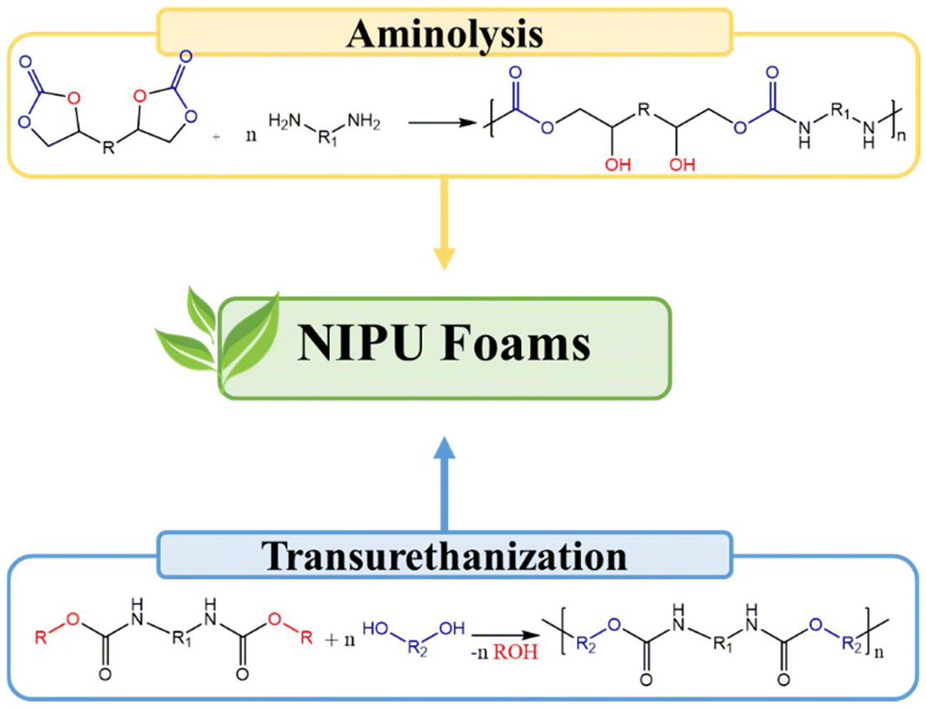 Polyurethane (PU) foams represent a wide class of polymeric materials, having applications in different sectors ranging from automotive, packaging, and cushioning/bedding to construction. However, their synthesis requires the use of petrol-based components, which are mostly harmful and toxic isocyanates. Considering this, non-isocyanate polyurethane (NIPU) foams have been demonstrated to be promising alternatives to conventional PUs, which are obtained through “isocyanate-free” routes such as the aminolysis of cyclic carbonates with diamines. The building blocks of NIPU foams can be derived from different bio-sources, such as vegetable oils, sugars, and terpenes. Moreover, the final NIPU materials can be fully reprocessed and recycled owing to the presence of suitable functional groups that facilitate dynamic bond exchange. This review aims to comprehensively describe the current state-of-the-art concerning the synthesis and applications of NIPU and hybrid NIPU foams and is divided into three sections: (i) an outline of the synthesis of bio-based NIPU precursors, i.e. cyclic and linear carbonates, diamines and carbamates, from biomass-derived and waste sources such as vegetable oils and CO2 and via environmentally friendly approaches; (ii) analysis of the reprocessability and recyclability of NIPU and composite NIPU foams; and (iii) evaluation of the environmental impacts of NIPU precursors and foams using the life cycle assessment (LCA) technique, preliminary investigations of their techno-economic analysis (TEA), and description of future perspectives.